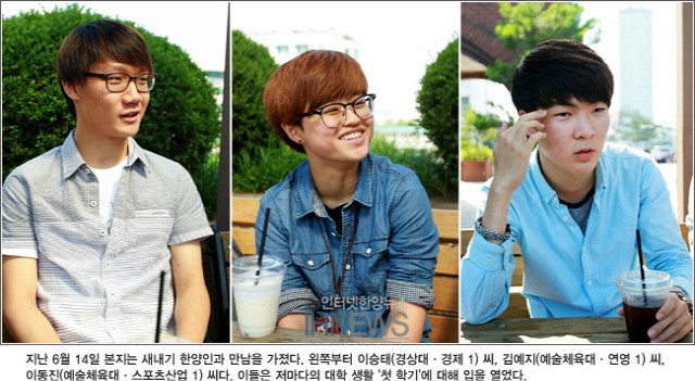 '새내기', 신입생 또는 신출내기를 뜻하는 말이다. 새내기들에게 첫 학기는 그들의 청춘이 시작되는 시기다. 밀물처럼 밀려왔던 한 학기가 썰물처럼 빠져나갔다. 하고 싶은 것도 많고, 고민도 많은 첫 학기를 보냈을 새내기 한양인을 만났다. 배규민(공과대·건설환경 1) 씨, 장민수(사회대·정외 1) 씨, 이동진(예술체육대·스포츠산업 1) 씨, 김예지(예술체육대·연영 1) 씨, 정소윤(언정대·광고홍보 1) 씨, 이승태(경상대·경제 1) 씨다.