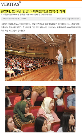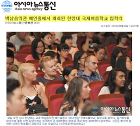 지난 30일 오전 10시 교내 백남음악관 메인홀에서는 '2014 한양 국제여름학교' 입학식이 열렸는데요. 입학식에 열심히 참여하는 학생들의 모습이 1일자 온라인매체 <베리타스알파>, <아시아뉴스통신>, <이투데이> 등을 통해 전해졌습니다.