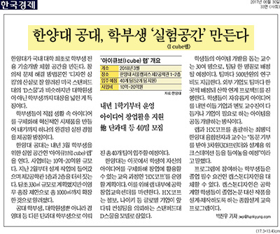 6월 30일 <한국경제>는 한양대가 국내 대학 최초로 학부생 전용 기술개발 체험 공간을 만든다는 내용을 전했습니다. 한양대 공대는 내년 3월 학부생을 위한 실험 공간인 '아이큐브(I cube) 랩'을 여는데요. 공대 학부생, 대학원생뿐 아니라 경영대 등 다른 단과대 학부생으로 이뤄진 총 40개 팀이 입주할 예정이며 한양대는 이곳에서 학생이 자신의 아이디어를 구체화해 창업에 활용할 수 있는 교육 과정인 ‘HX코프’를 운영할 계획입니다. 스탠퍼드대 D스쿨을 모델로 삼은 HX코프는 학생들의 아이템 개발을 돕는 교수는 30여 명으로, 팀당 한 명꼴로 배정될 예정이며 팀마다 500만원의 연구비도 지급할 계획입니다. 이에대해 랩과 HX코프를 총괄하는 최병덕 융합전자공학부 교수는 "동문 기부를 받아 3차원(3D)프린터와 설계용 워크스테이션 등을 들여놓을 예정이다"라고 말했습니다.