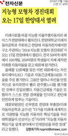 미래사회를 바꿀 지능형 자율주행자동차 레이스가 오는 17일 한양대에서 개최됩니다. 미래자동차공학과가 주최하고 한양대 자동차전자제어연구소가 주관하여 열리는 이 대회에는 전국 50여개 대학에서 100개팀, 350여명의 학생들이 자체 제작한 미래형 자동차들을 가지고 참가할 예정인데요. 대회위원장인 선우명호 미래자동차공학과 교수는 "다가올 미래에 세계적으로 각광받을 지능형 자동차의 핵심기술을 우리 대학생들이 선보이는 것"이라며 "지능형 자동차 설계분야에서 인재양성을 위한 토대"라고 말했습니다.