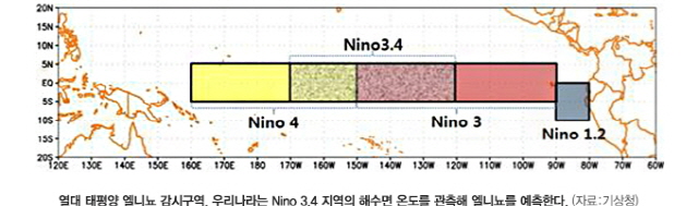 엘니뇨란 남미 페루 및 에콰도르 서부 중∙동태평양 해수면 온도가 평년값보다 2-3℃ 상승하는 현상을 일컫는 말이다. 2-7년 주기로 불규칙적으로 발생한다. 엘니뇨란 스페인어로 ‘남자 아이’ 또는 ‘아기 예수’를 의미한다. 보통 엘니뇨가 12월 말경 크리스마스시기에 발생하기 때문에 붙여진 이름이다.