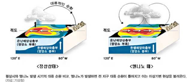 평소 적도 부근의 태평양 서쪽 표면에는 따뜻한 바닷물이 모이고, 표층 물이 밀리는 동쪽에는 상대적으로 온도가 낮은 해저의 차가운 물이 올라온다. 무역풍은 주로 해상에서 불기 때문에 바닷물을 밀어주는 역할을 한다.그런데 무역풍이 약해져 물이 덜 밀리면 서쪽은 따뜻한 물이 부족하고, 동쪽은 따뜻한 물이 넘치는 상황이 된다. 이 상황이 지속되는 것이 엘니뇨다. 엘니뇨와 함께 자주 거론되는 라니냐(La Nina)는 이 무역풍이 강해져서 중∙동태평양 해수면 온도가 평년보다 낮아지는 것을 일컫는다.