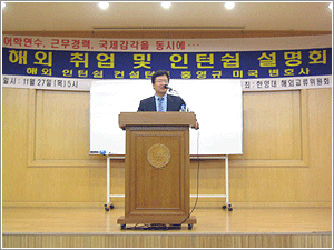지난달 27일, 해외교류위원회 주최로 서울캠퍼스 박물관 세미나실에서 열렸던 ‘해외 인턴십 설명회’에 몰린 인파는 이 같은 현실을 잘 반영하고 있다. 이날 행사에는 해외 인턴십 컨설턴트로 잘 알려진 홍영규 미국 변호사가 직접 연단에 나섰다. 중앙일보와 매경 이코노미 등에 이민과 유학 칼럼을 연재한 바 있는 홍영규 변호사는 현재 한국일보에 ‘홍영규의 유학 컬럼’을 집필 중이다.