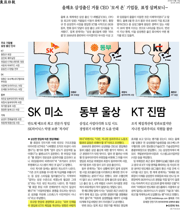 올해 초 KT는 황창규 전 삼성전자 사장을 영입하면서 대규모 구조조정을 진행했는데요. KT 내부에선 나태했던 조직의 타성이 사라졌다는 평가와 업무 강도가 삼성만큼 높아졌다는 불만이 공존하고 있다고 합니다. 유규창 경영학부 교수는 "외부 인재들이 영입돼 KT의 체질을 개선하는 방향은 바람직하다"면서도 "다만, 지나친 성과주의나 노동조합과의 갈등은 피해야 할 것"이라고 조언했습니다.