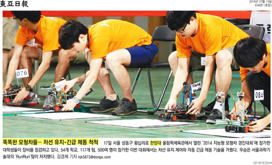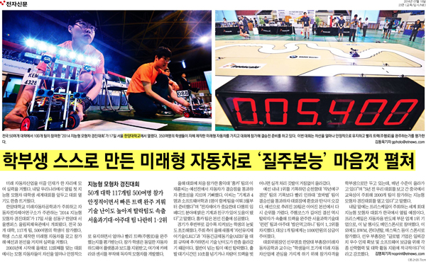 지난 17일 한양대학교에서는 전국 50여개 대학에서 100개 팀이 참여한 '2014 지능형 모형차 경진대회'가 열렸습니다. 미래 자동차산업을 이끌 인재들이 스스로 제작한 미래형 자동차를 갖고 참가해 예선과 본선을 거치며 실력을 겨뤘는데요. 뜨거웠던 대회의 열기가 18일자 <전자신문>, <동아일보>, <MBC>뉴스 등을 통해 전해졌습니다.