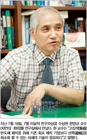반도체 시장 조사기관인 미국의 HIS Technology사(社)에 따르면 우리나라가 메모리 시장 강세, 모바일 반도체 경쟁력 강화 등에 힘입어 미국에 이어 세계시장 점유율 2위에 올랐다. 몇몇 기업의 주도 아래 우리나라는 반도체 강국으로 빠르게 성장했다. 오늘도 기존 반도체 공정의 한계를 뛰어넘기 위한 연구는 끊이지 않는다. 차세대 반도체를 위해 연구하는 한양규 교수(자연대·화학)가 7월 '이달의 연구자상'을 수상했다.