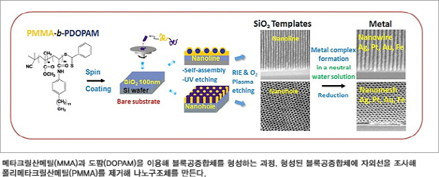 한 교수는 이런 난제를 극복하기 위해 결정성 단량체로서 새로운 구조의 DOPAM(도팜) 단결정을 최초로 제조했다. 합성된 결정성 단량체 도팜과 기존의 무정형 단량체 메타크릴산메틸(MMA)을 공중합해 다양한 조성 및 분자량을 갖는 새로운 PDOPAM-PMMA 블록공중합체를 탄생시킨 것. 이를 이용해 이산화규소가 코팅된 실리콘웨이퍼 위에 박막을 코팅한다. 블록공중합체가 자기조립으로 나노구조체를 발현하면 자외선을 조사해 폴리메타크릴산메틸(PMMA)을 분해해 제거한다. 남아있는 폴리도팜(PDOPAM) 나노선 및 나노홀에 반응이온에칭 및 산소플라즈마에칭 공정을 수행해, 5.0㎛ 이상의 대면적에 25nm에서 10nm 사이의 선폭 또는 직경을 갖는 이산화규소 나노구조체(나노선 또는 나노홀)를 처음으로 만들었다.