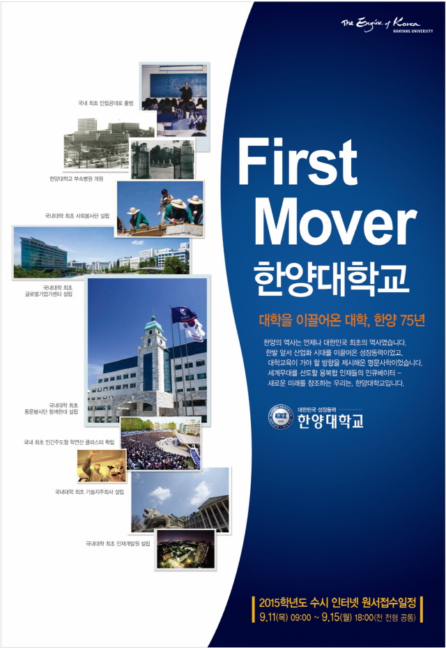 75년의 역사 가운데 대한민국 최초의 타이틀을 가진 것들이 광고 가득 채워져 있다. 국내 최초 민립공대로 출범한 것을 시작으로, 부속병원 개원, 국내대학 최초 사회봉사단 설립, 글로벌기업게센터 설립, 동문봉사단 함께한대 설립, 민간주도형 학연산 클러스터 확립, 기술지주회사 설립, 인재개발원 설립 등 많은 것들이 '국내 최초'라는 타이틀을 가지고 있다. 그래서 이것을 한 마디로 'First Mover'라고 지칭하고 타이틀을 내 걸었다.