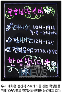 우리대학은 인생의 코너에 몰린 학생들을 위해 '한양상담센터'를 운영하고 있다. 한 학기에 250명이 넘는 학생들이 찾을 정도로 제 역할을 톡톡히 해내고 있다. 학생들이 상담센터를 찾아오는 이유는 다양하다. 저학년은 주로 대인관계에 어려움을 느끼고 상담센터를 찾아오고, 고학년일수록 진로 문제와 취업스트레스로 상담센터의 문을 두드린다.