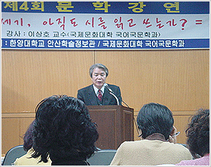 지난 29일, 안산학술정보관과 국어국문학과가 공동 주최한 제4회 문학 강연이 개최됐다. 이번 강연은 '웅덩이를 파다','꽃의 보복','압력솥'과 같은 시로 잘 알려진 이상호(국문대 · 국어국문학)교수가 강사로 초청돼 '21세기, 아직도 시를 읽고 쓰는가?'라는 주제로 2시간여의 강연을 진행했다. 제3공학관 1층 세미나실에서 진행된 이번 강연에는 재학생을 비롯해 안산연성문학회,청산문학회 회원 등 한양 가족 및 안산시민들이 참석했다.