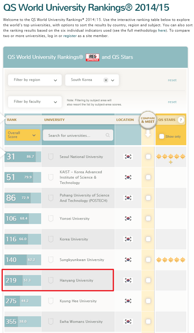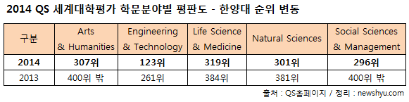 | 2014 QS 세계대학평가 한양대 관련 내용 (공식 QS 홈페이지 캡처)