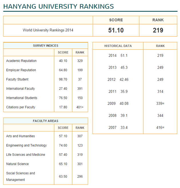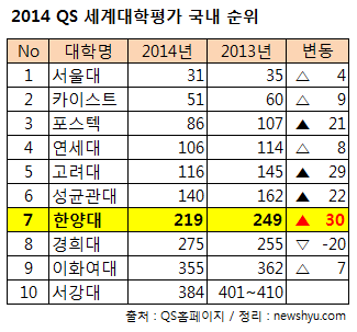 영국의 글로벌 대학 평가 기관인 QS(Quacquarelli Symonds)가 15일 발표한 '2014 세계대학평가'에서 한양대는 세계 219위로 국내 대학 중 7위에 올랐다. 전년대비 30계단을 뛰어오르며 국내 대학중 가장 큰 상승폭을 기록했다.