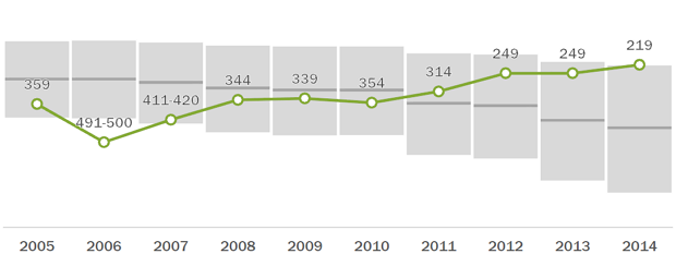 한양대는 최근 5년간 꾸준하게 상승세를 이어가고 있다. 2010년도 354위에서 무려 135계단을 상승한 것이다. 특히 올해의 경우 전체 평가점수의 50%를 차지하는 평판도(동료 연구자, 기업임직원 졸업생평가)에서 좋은 점수를 얻은 것이 순위 상승의 원인으로 분석되고 있다. 특히 199위에 랭크된 졸업생 평판도는 약 100계단 가까이 상승한 것으로 나타났다. 아울러 이 평판도 지표는 QS사에서 자체적으로 수행한 최근 3년간의 설문조사 결과를 사용한 만큼 향후 지속적인 상승도 기대해볼만 하다. 또한 반영 비율은 높지 않지만 외국인학생비율(5%적용)은 세계 150위에, 교수 1인당 학생수(20%반영)는 37위에 랭크되면서 국제화 수준과 교육의 질에 대한 좋은 평가를 받고 있음을 알 수 있다.
