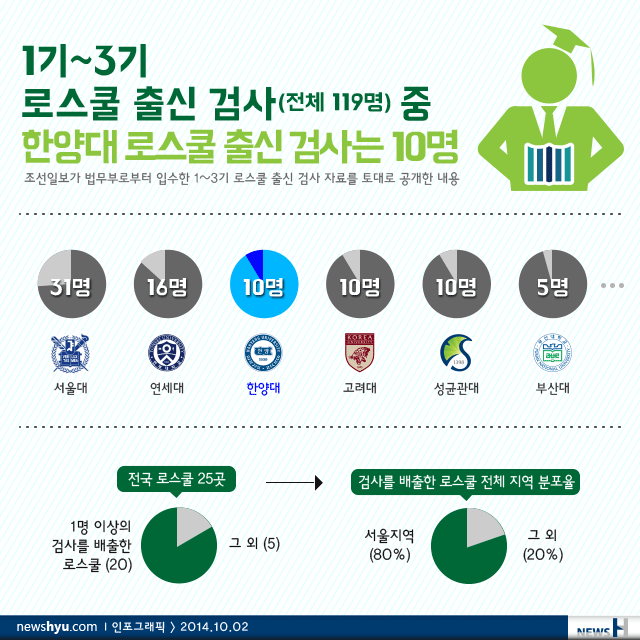 한양대는 학부 출신 검사는 없었으나 한양대 로스쿨에서 배출한 검사는 지난 3년간 10명이었다.