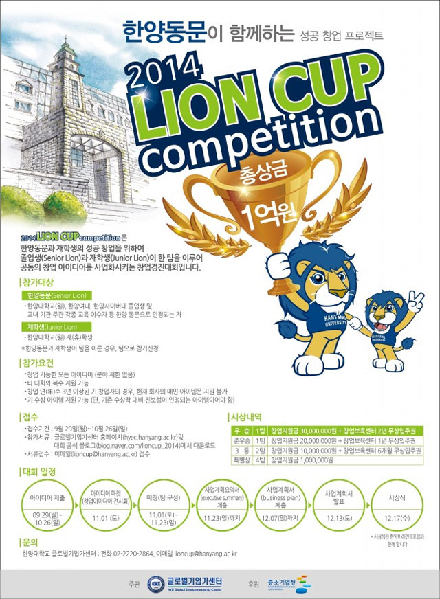 기타 자세한 사항은 한양대 글로벌기업가센터(전화 02-2220-2864) / 이메일 lioncup@hanyang.ac.kr로 문의하면 된다.