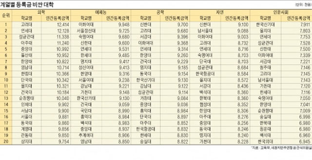 계열별로 등록금이 가장 비싼 대학은 의학계열 고려대(1,241만4천원), 예체능계열 이화여대(994만8천원), 공학계열 신한대(910만원), 인문사회계열 한국산기대(791만원)로 집계됐다. 평균적으로는 계열별 의대, 공학, 예체능, 자연, 인문사회계열 순으로 평균 등록금이 많았다.