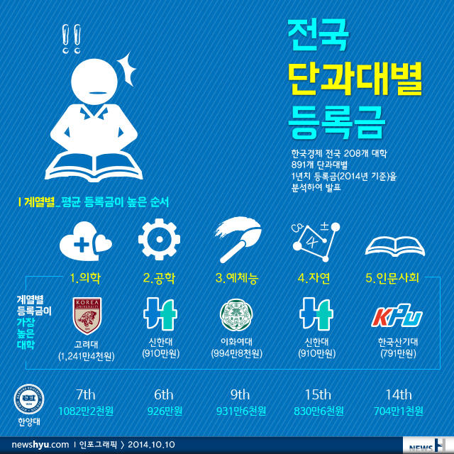 한양대는 공학계열 926만원으로 6위, 의학계열 1082만2천원으로 7위, 예체능계열은 931만6천원으로 9위, 인문사회계열 704만1천원으로 14위, 자연계열 830만6천원으로 15번째로 등록금이 높은 것으로 나타났다.