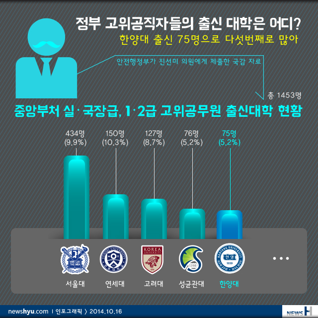 현재 정부 중앙부처의 고위공무원단 1453명 중 한양대 출신이 75명으로 전국 대학 가운데 5번째로 많은 것으로 나타났다.