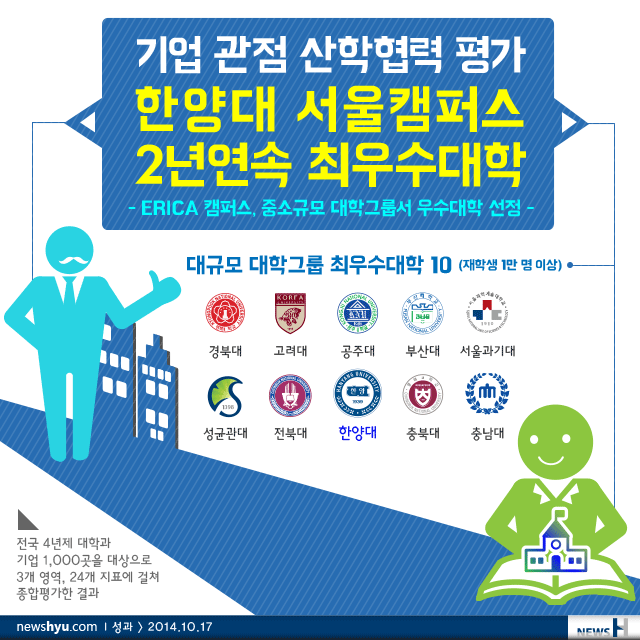 한양대학교가 '2014 기업관점 산학협력 평가'에서 2년 연속 최우수대학으로, ERICA 캠퍼스는 우수대학으로 선정됐다.