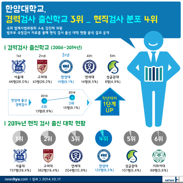 또한, 2006년(경력검사 첫 임용)부터 지금까지 임용된 경력검사 가운데는 한양대가 서울대 46명(28.0%), 고려대 43명(26.2%)에 이어 15명(9.1%)으로 3위를 기록해 약진하는 모습을 보였다.
