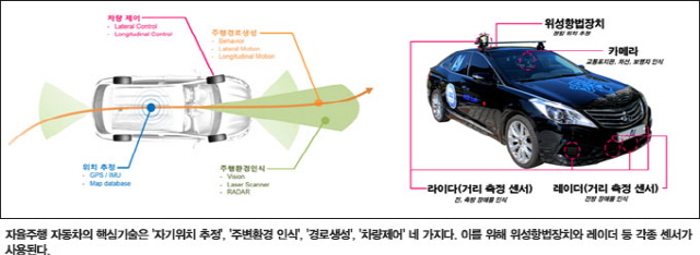 장철훈 씨는 자율주행 자동차의 핵심으로 ‘자기 위치 추정’, ‘주변환경 인식’, ‘경로생성’, ‘차량제어’를 꼽았다. “위치 추정은 자동차가 현재 어느 위치에 있는지 아는 기술입니다. 주변환경인식은 주변 사물이나 도로환경을 파악하는 기술입니다. 그리고 경로 생성 기술을 통해 그런 주변환경 정보와 위치 추정 정보를 이용해 차를 어떤 식으로 운행할건지 결정하고 그 경로를 따라 핸들을 돌리거나 엑셀페달을 밟게 하는 것이 차량제어 기술입니다.”