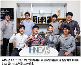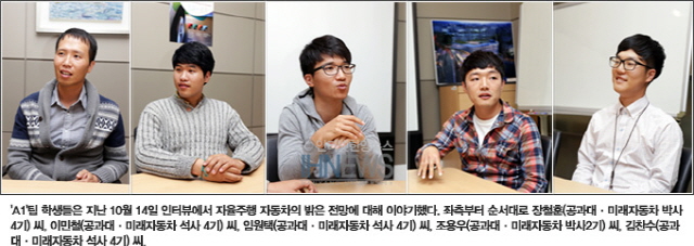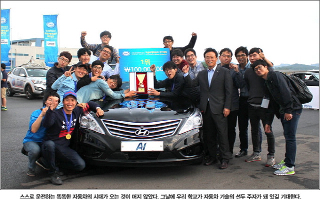 경찰청 조사에 따르면 2012년 기준 우리나라 한해 교통 사고 발생건수는 22만 건을 넘으며, 그 중 안전운전 불이행으로 인한 사고가 전체의 78%를 차지했다. 만일 자동차가 스스로 안전운전을 하고 도로를 달리는 세상이 온다면 어떨까? 먼 미래의 이야기 같지만 이미 전 세계 자동차 기업은 이를 실현시킬 수 있는 ‘자율주행자동차’ 기술 개발에 매진하고 있다. 우리 대학 선우명호 교수(공과대·미래자동차)가 이끄는 ‘A1’팀은 현대자동차가 주최한 ‘제12회 자율주행자동차 경진대회’에서 우승을 차지했다. 선우명호 교수와 ‘A1’팀 장철훈(공과대·미래자동차 박사 4기) 씨, 이민철(공과대·미래자동차 석사 4기) 씨, 임원택(공과대·미래자동차 석사 4기) 씨, 조용우(공과대·미래자동차 박사2기) 씨, 김찬수(공과대·미래자동차 석사 4기) 씨, 조기춘(공과대·미래자동차 포닥) 씨, 김진수(공과대·미래자동차 포닥) 씨, 김동철(공과대·미래자동차 박사10기) 씨, 김승기(공과대·미래자동차 박사 4기) 씨, 김창섭(공과대·미래자동차 박사 4기) 씨를 만나 자율주행 자동차에 대한 이모저모를 들을 수 있었다.