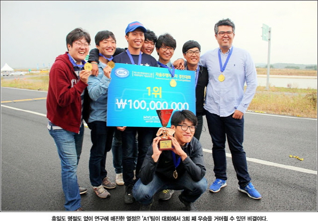 A1팀은 2010년, 2012년 대회에 이어 올해 대회도 우승해 3관왕을 거머쥐었다. 우승의 비결에 대해 임원택 씨는 ”다양한 날씨 조건에 대해 미리 대비를 한 것”이라고 꼽았다. “비가 오든 햇빛이 강하든 다양한 조건에서 테스트를 했었고, 테스트 횟수도 정말 많습니다. 그게 다른 팀과의 차이점이 아닐까요?” 조용우 씨 역시 “추석 때도 집에 내려가지 않고 연구실에서 팀원들과 연습을 했다”며 “집이 지방인데 2년 동안 거의 집에 가본 기억이 없다. 그래도 이렇게 우승을 하면 다 보상을 받을 수 있다”고 그간의 고생을 털어놓았다.