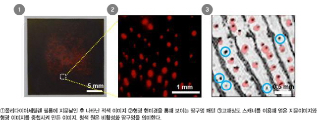 김 교수는 이를 해결하기 위해 땀구멍에서 나오는 소량의 물과 반응해 색의 변화를 가져오는 센서소재인 수변색 물질(물과 반응하여 색이 변하는 물질)인 폴리다이아세틸렌(PDA, polydiacetylene)을 이용해 지문에서 땀구멍만 추출해 땀구멍지도를 만들었다. 본래 청색을 띄는 폴리다이아세틸렌은 물과 반응하면 적색이 발현되는 성질을 가지고 있다. 땀 속에는 98%의 수분과 그 외에 아미노산, 무기질, 지방 등의 물질이 존재하는데, 폴리다이아세틸렌으로 만든 필름에 손가락을 찍으면 땀샘에서 나온 땀이 찍혀 적색의 이미지를 얻을 수 있다. 이를 형광현미경으로 관찰하면 땀구멍 패턴을 얻을 수 있는 것. "물과 반응하는 수변색 물질은 이미 많이 알려져 있죠. 하지만 땀구멍 추출을 위해 아주 소량의 물에만 반응하는 물질을 개발했습니다. "