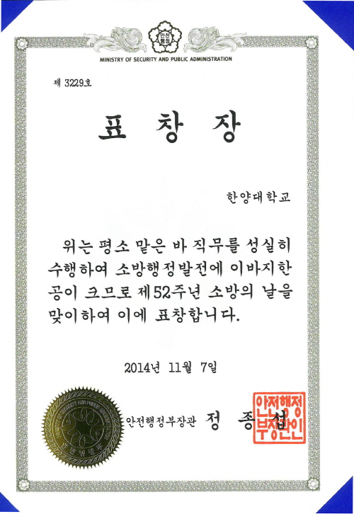 한양대(총장 임덕호)가 최근 ‘제52주년 소방의 날’ 기념식에서 기관 표창(안전행정부 장관상)을 수상했다.