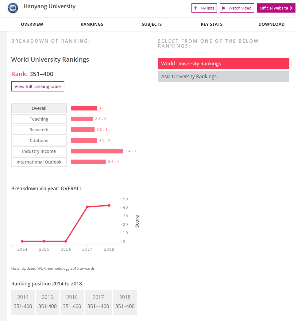 ▶ THE 2018 세계대학순위 한양대 개별 순위 및 점수 보러 가기 (클릭)