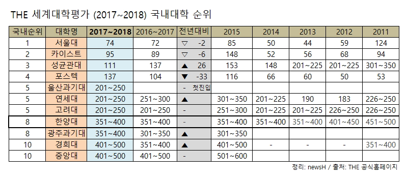 이번 평가에서 세계대학 상위 1000위 이내에 이름을 올린 국내 대학은 서울대, KAIST, 성균관대, 포스텍, 울산과기대, 연세대, 고려대, 한양대, 광주과기대, 경희대, 중앙대, 이화여대, 건국대, 세종대, 울산대, 전북대, 전남대, 인하대, 경북대, 부산대, 서울시립대, 서강대, 영남대, 아주대, 충남대, 한림대, 서울과학기술대 등 27곳이다.