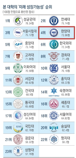 | ▲ 고교생이 본 대학의 미래 성장가능성 순위(100점 만점으로 환산된 점수)에서 한양대학교(73.96점)는 4위로 나타났다.(이미지출처: 고교생 연구소) | ||