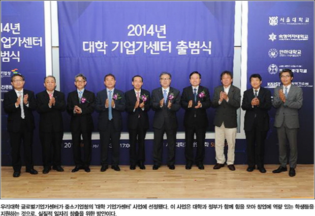 우리 대학 글로벌기업가센터가 최근 중소기업청의 ‘대학 기업가센터’ 사업에 선정됐다. '대학 기업가센터'는 정부의 창업 지원 사업이다. 대학 내 여러 조직에 분산 운영되고 있는 창업 교육, 창업 연구, 창업 네트워킹이 효율적으로 운영될 수 있도록 돕는 것을 목표로 한다. 국내 대학의 풍부한 인적자원과, 기술자원에도 불구하고 이를 효율적으로 활용할 연계 시스템이 부족하다는 인식에 따라 '대학 기업가센터'를 통해 대학 구성원의 창업 접근성을 높이고, 대학의 창업수요에 대응하는 한편, 대학별 기업가 센터의 자생적 운영을 유도하고자 한다.