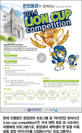 또한 대학 내 창업 동아리 학생들과 동문창업 활성화를 위한 창업준비공간인 '스타트업 사우나'를 만들어 학생들의 인큐베이팅을 위해 각종 세미나, 워크숍 등을 운영하고 있다. 타 대학과는 차별화 된 우리 대학 중점 프로그램은 무엇인지 물었다. "2012년에 개설된 한양스타트업아카데미는 CEO양성 사관학교로서 창업가를 많이 배출하기 위한 핵심 프로그램입니다. 실제로 창업자 배출율이 높죠. 또 올해 처음 설립한 한양테크벤처프로그램은 이공계열, 상경계열, 인문계열, 예체능계열의 학생들간에 융합을 통해 창업에 대한 열정과 도전정신이 있는 학생을 발굴하고 체계적인 교육과 멘토링으로 기술창업가 양성을 목적으로 하고 있어요. 마지막으로 졸업생과 재학생이 한 팀을 이뤄 공동 창업 아이디어를 사업화시키는 라이언컵 컴피티션(Lion cup competition)은 국내 대학 최초로 시도하는 차별화된 프로그램입니다. 통상 창업경진대회와는 다르게 창업의 꿈을 갖고 있는 대학(원)생들과 졸업동문들이 자신의 창업아이디어를 내걸고, 대학이 발굴해서 창업지원금과 창업보육센터 무료공간을 제공해주는 것이 특징입니다."