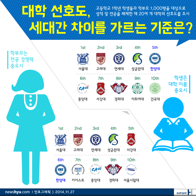 대학 선호도와 관련해 학부모와 학생의 우선순위가 엇갈리는 것으로 나타났다. 예로부터 고등학생들에게 주문처럼 외워지는 소위 ‘대학 서열’이 아닌, ‘대학 선호도’ 분석을 위해 내일신문 자매지 『미즈내일』이 설문을 진행했다. 이를 위해 고등학교 1학년 학생들과 학부모 1,000명을 대상으로 성적 및 전공을 배제한 채 20여 개 대학의 선호도를 조사했다. 그 결과, 학부모와 학생 간 큰 격차가 드러나진 않았지만, 일부 대학들의 선호도에서 다소 차이점이 밝혀졌다.