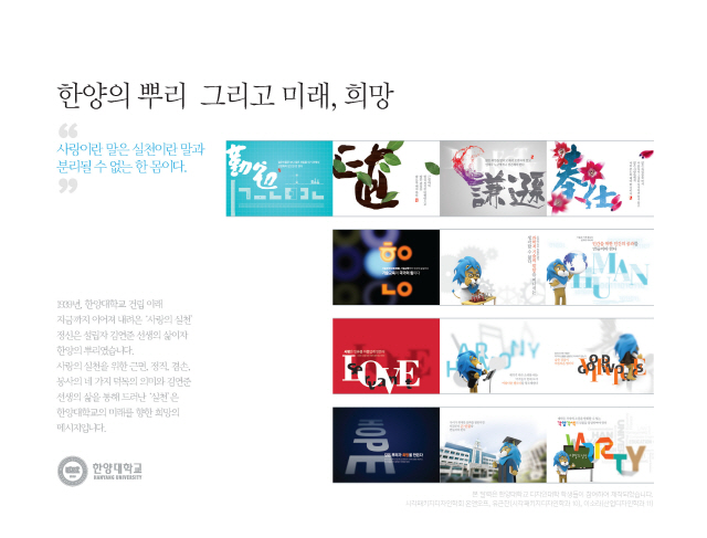 한양대학교의 건학 이념인 '사랑의 실천'에서부터 근면,정직, 겸속, 봉사 라는 4대 덕목과 9개의 의미있는 문구를, 한양을 상징하는 그림과 함께 한달에 한장씩 넘길 수 있도록 구성되었다. 그래픽 대부분은 문자에 미적 요소를 더해 만든 '타이포 그래픽'을 최대한 활용하되 6컷의 사자캐릭터도 등장해 한양의 상징인 '사자'를 부각시키면서 친밀감을 더했다.