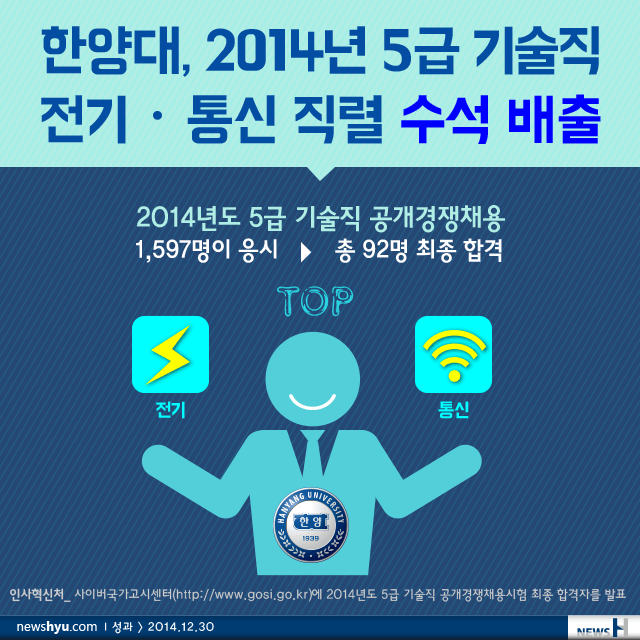 지난 12월 22일 인사혁신처는 사이버국가고시센터(http://www.gosi.go.kr)에 2014년도 5급 기술직 공개경쟁채용시험 최종 합격자를 발표했다. 이번 공채에는 1,597명이 응시해 총 92명(전국모집 83명, 지역모집 9명)이 최종 합격의 기쁨을 안았다.