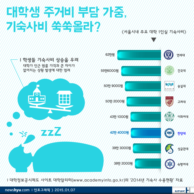 대학생들이 체감하는 의식주 비용 부담이 날로 높아지는 가운데, 최근 대학 기숙사비 책정이 뜨거운 감자로 떠올랐다. 학생들에게 저렴한 값에 제공되던 기숙사가 요즘에는 대학가 인근 원룸 가격보다 비싸다는 것. 이에 학생들은 기숙사비의 상승을 우려하는 상황이다. 대학정보공시제도 사이트 대학알리미(www.academyinfo.go.kr)의 ‘2014년 기숙사 수용현황’ 자료에 따르면, 1인실 기숙사비 기준으로 연세대, 건국대·가톨릭대 제3캠퍼스, 숭실대, 고려대, 이화여대, 한양대(42만 4000원) 순으로 높은 금액이 책정돼 있다.