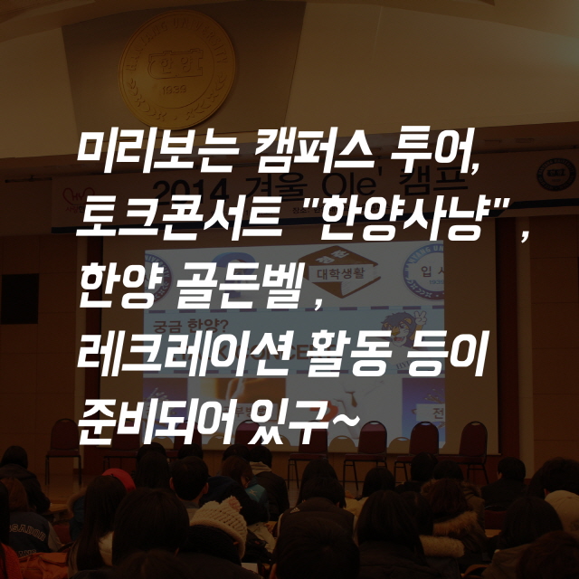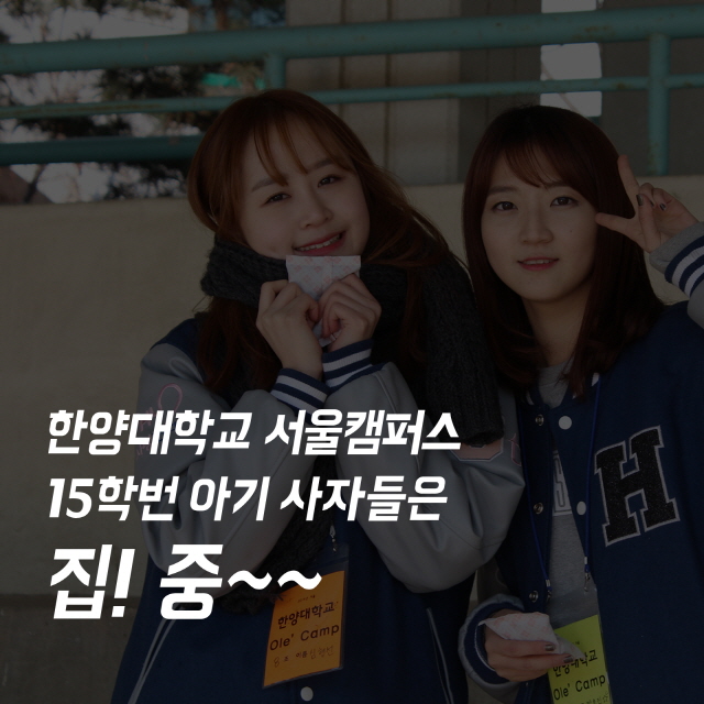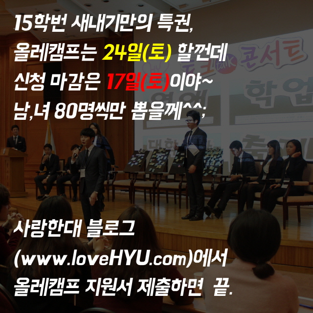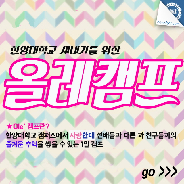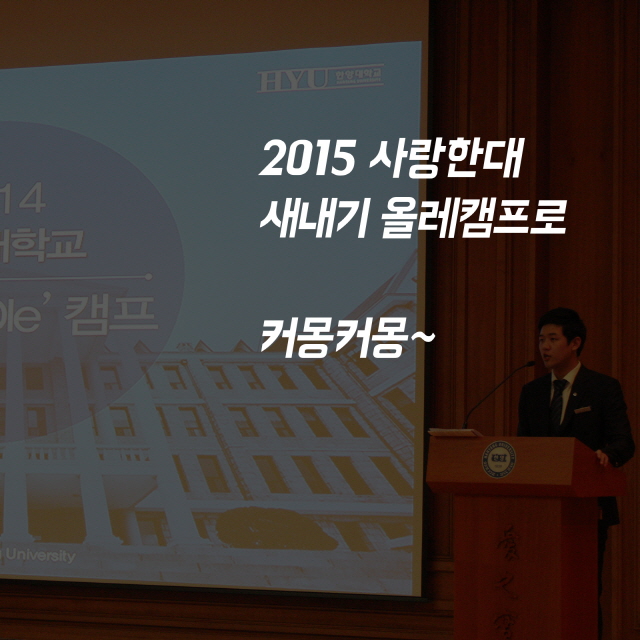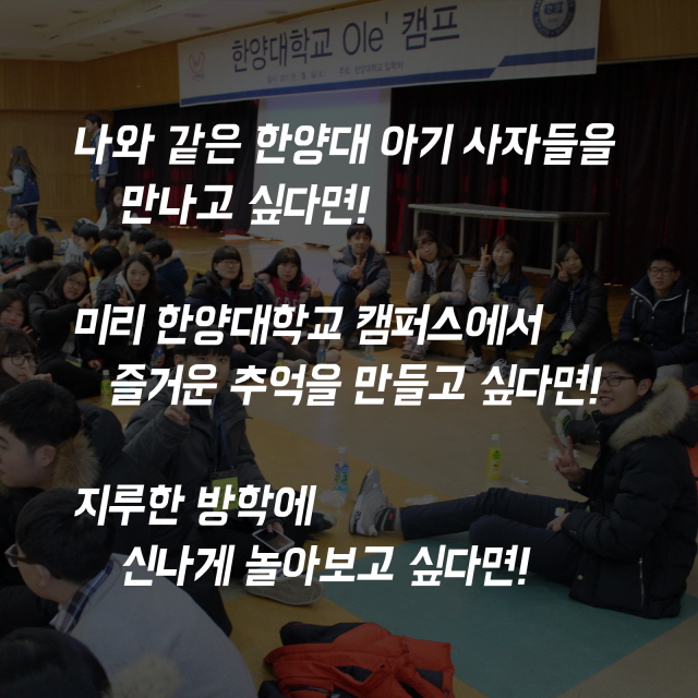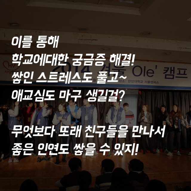한양대학교 재학생 홍보대사 '사랑한대'가 2015학번 신입생들을 위한 '올레캠프'를 개최합니다. 올레(Ole)캠퍼는 학교 안에서 선배들과 신입생들이 어울려 다양한 활동을 하는 1일 캠프로 매년 정기적으로 진행이 되고 있습니다. 이번에도 어김없이 신입생들을 초대하고 있네요. 신입생들을 향한 홍보대사의 즐거운 초대장을 보시죠! 아. 아래 이미지에 사용된 배경 사진은 작년 올레캠프의 모습입니다.
