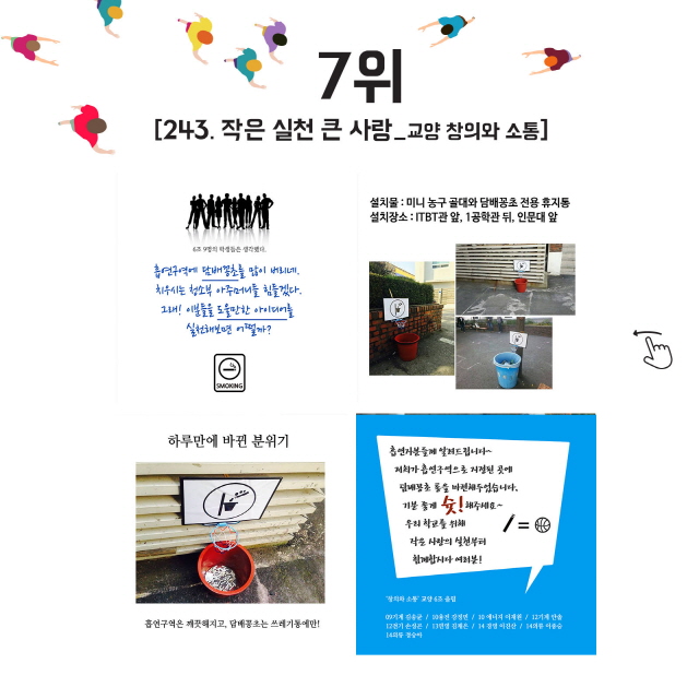 | ▲ [243. 작은 실천 큰 사랑] 혹시 보셨나요? 흡연구역에 설치된 미니농구대요. 한양대 교양수업 '창의와 소통' 팀 프로젝트로 진행하고 있다고 합니다^^ https://www.facebook.com/HanyangUniv/posts/852951254739700 | ||