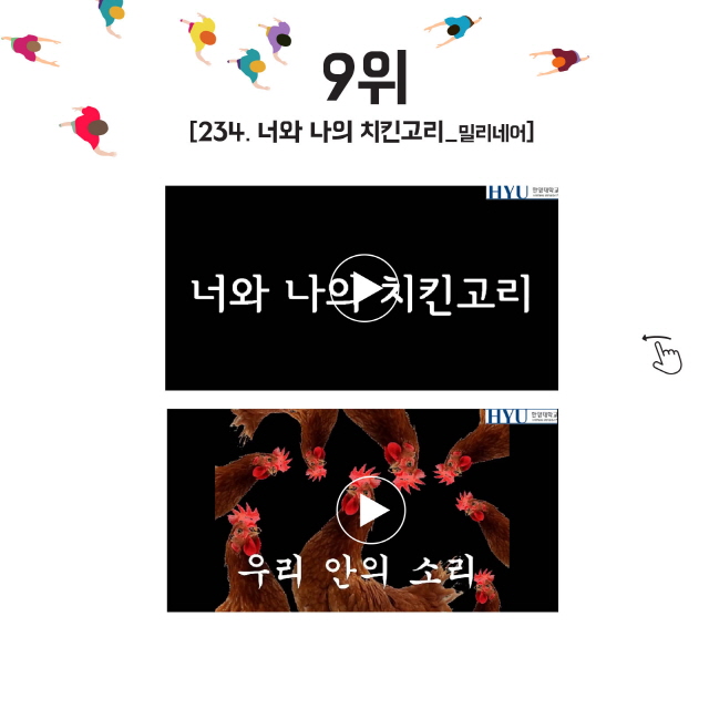 | ▲ [234. 너와 나의 치킨고리] 2014 한양가요제 대상에 빛나는 '밀리네어'팀이 <치킨고리> 영상을 보내왔습니다. 함께 즐겨요!!https://www.facebook.com/video.php?v=844402248927934 | ||