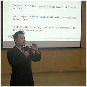 이번 행사에서는 영문 이력서 및 자기소개서 작성법과 주요 기업의 영어 인터뷰 방법이 소개됐다. 특강은 ‘HIEnglish Korea’ 제이 윤(Jay Yoon) 지사장이 맡았다. ‘HIEnglish Korea’는 현대자동차, 로레알 등의 기업 교육을 위탁 운영하고 있는 기업 연수 기관. 윤 씨는 다년간 연수 경험을 통해 얻은 기업 내 정보를 바탕으로 기업이 원하는 스타일에 대한 자세한 정보를 수강생들에게 제공했다.