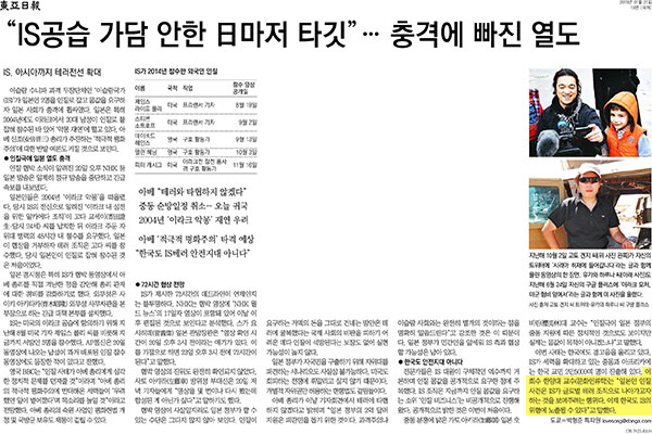 21일자 <동아일보>에는 IS가 일본인 2명을 인질로 잡아 몸값을 요구하고 있는 사태에 대한 기사가 게재되었습니다. 이희수 문화인류학과 교수는 "일본인 인질 사건은 IS가 글로벌 테러 조직으로 나아가고자 하는 것을 보여주려는 행위다. 이제 한국도 IS의 위협에 노출될 수 있다"고 말했습니다.