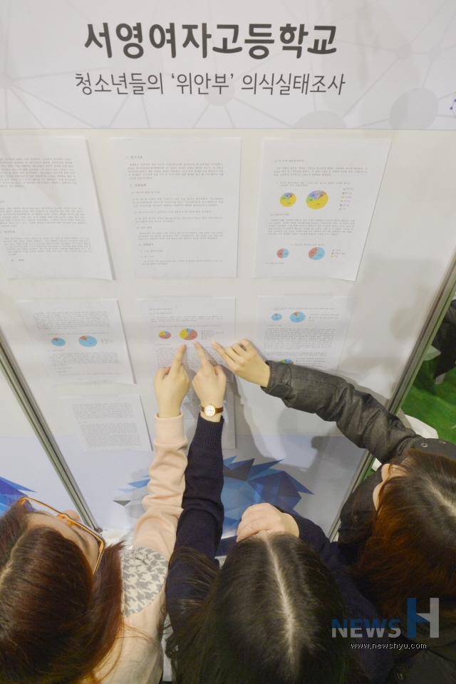 | ▲ '제1회 HY-High 학술대회' 행사장에서 전북 서영여고 교사와 학생들이 만든 ‘청소년들의 위안부 의식 실태조사’ 패널을 보고 있다. | ||