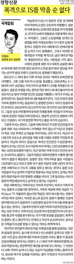 2일자 <경향신문>에는 이희수 문화인류학과 교수가 'IS 궤멸'에 대한 기고글을 전했습니다. 이 교수는 IS 궤멸을 위한 반테러법이나 무차별 폭격에 대해 "사태의 본질에 대한 서구사회의 교묘한 왜곡과 테러에 대한 진지한 원인 분석이나 처방없이 테러 양산을 부추기는 공격적 발상 자체는 근본적으로 잘못됐다"고 말했는데요. 그는 "미국이나 이스라엘의 공격으로 인한 무고한 시민 증오 집단에 대한 치유와 진정한 사죄도 훨씬 더 중요한 선결과제임을 잊어서는 안된다"며 "증오와 복수의 문화를 치유하는 일이 무엇보다 우선시되어야 한다"고 말했습니다.