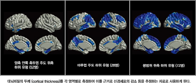 이를 바탕으로 이 교수는 “MRI 장치로 정상환자와 치매환자를 구분하는 것을 넘어서 대뇌피질 응축 위치와 진행 상태를 보고 3가지 치매질환 종류를 구분했다는 것이 이번 연구에서 가장 주목할 점이다”라고 전했다. 고해상도의 MRI 장치로 총152명의 조기 알츠하이머 치매 환자의 뇌를 촬영했다. 환자들의 대뇌피질 두께를 분석해 다양한 대뇌피질 수축 패턴이 나타났다. 대뇌피질 수축형태를 패턴과 위치에 따라 분류해 의미 있는 연구 결과를 도출한 것이다. 양측 안쪽 측두엽 주도 위축 하위 유형 (52명), 마루엽 주도 하위 유형 (28명), 거의 모든 대뇌피질이 위축을 드러내는 분산된 하위영역(72명)으로 총 3가지 종류로 분류 됐다.