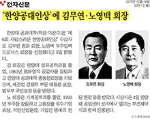 4일자 <전자신문>, <한국경제>, <한겨레>에는 한양대 공과대학이 '제6회 자랑스런 한양공대인상' 수상자로 김무연 평화 회장과 노영백 우주일렉트로닉스 회장을 선정했다는 소식이 전해졌습니다.