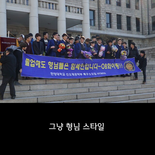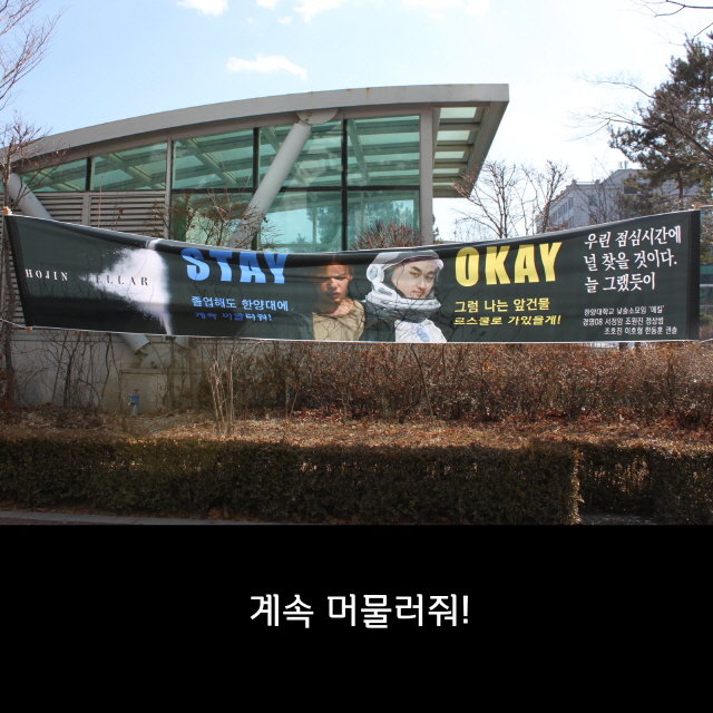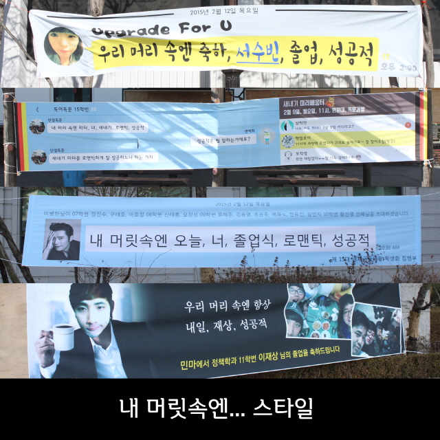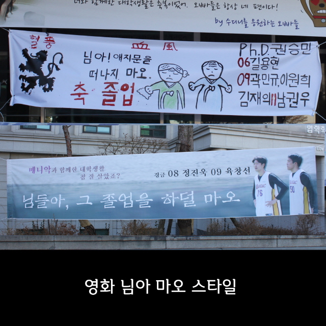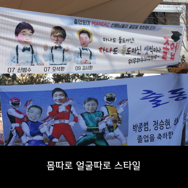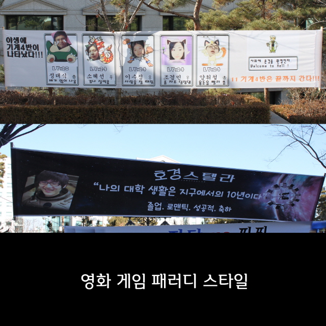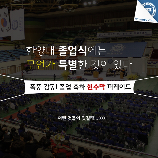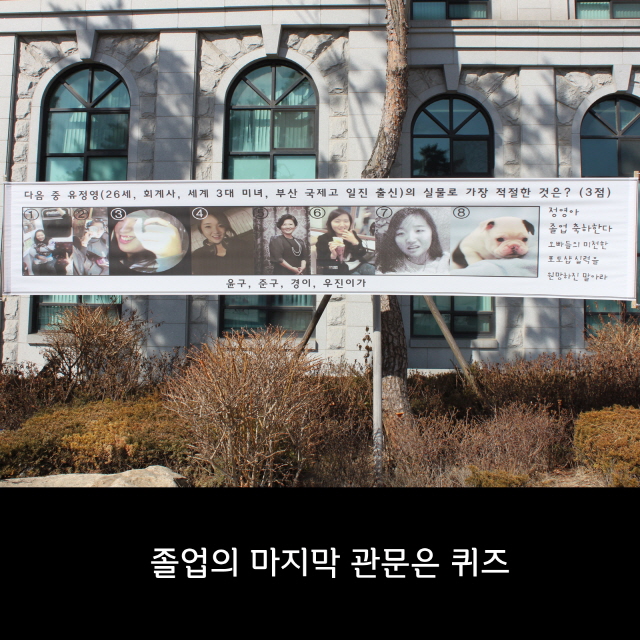 매년 졸업식 날이 되면 캠퍼스는 학사모와 가운을 걸친 학생들과 가족들로 붐빕니다. 이곳저곳에서 사진도 찍고 특별한 날의 기분을 만끽하게 되는데요. 요즘 이 졸업식 현장에 유행처럼 번지는 것이 있다고 합니다. 바로 ‘현수막 축하’입니다. 학과 또는 동아리 선배의 졸업을 축하하는 뜻으로 캠퍼스 곳곳에 현수막을 걸어주는 이벤트입니다. 그런데 이런 것들이 해가 가면서 점점 더 다양하고 재밌어지고 있어 눈길을 끕니다. 각종 패러디와 독창적인 컨셉으로 즐거움을 주는 것은 물론 졸업하는 당사자에겐 가슴 뭉클한 추억을 남겨주고 있습니다. 매년 진화하고 있는 한양대만의 이색적이고 창조적인 현수막 퍼레이드. 지금 소개합니다.