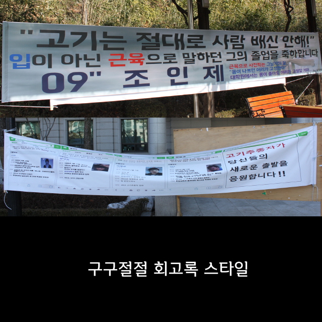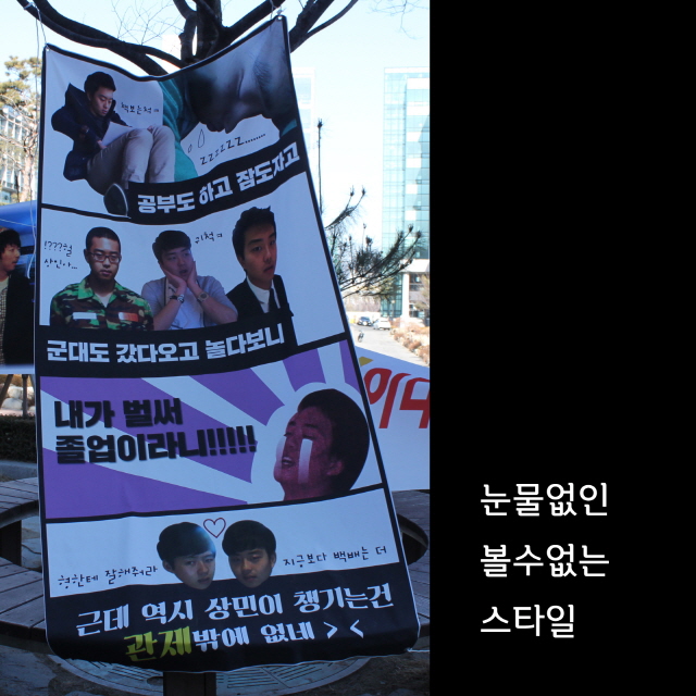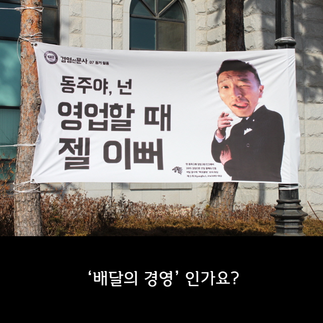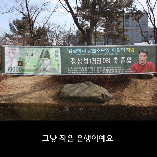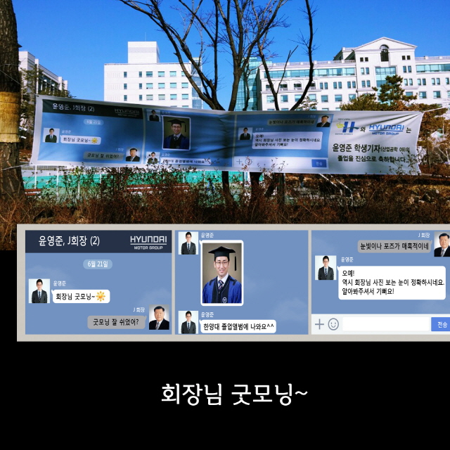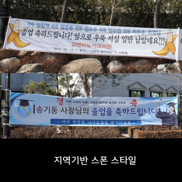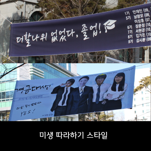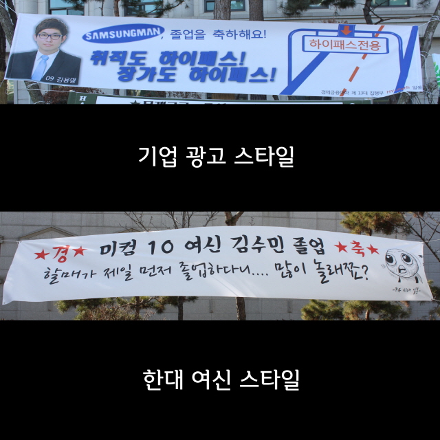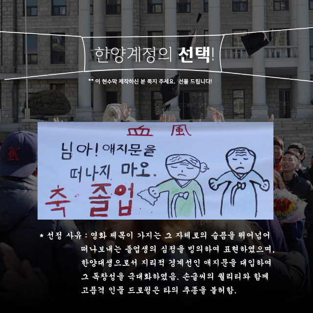 매년 졸업식 날이 되면 캠퍼스는 학사모와 가운을 걸친 학생들과 가족들로 붐빕니다. 이곳저곳에서 사진도 찍고 특별한 날의 기분을 만끽하게 되는데요. 요즘 이 졸업식 현장에 유행처럼 번지는 것이 있다고 합니다. 바로 ‘현수막 축하’입니다. 학과 또는 동아리 선배의 졸업을 축하하는 뜻으로 캠퍼스 곳곳에 현수막을 걸어주는 이벤트입니다. 그런데 이런 것들이 해가 가면서 점점 더 다양하고 재밌어지고 있어 눈길을 끕니다. 각종 패러디와 독창적인 컨셉으로 즐거움을 주는 것은 물론 졸업하는 당사자에겐 가슴 뭉클한 추억을 남겨주고 있습니다. 매년 진화하고 있는 한양대만의 이색적이고 창조적인 현수막 퍼레이드. 지금 소개합니다.