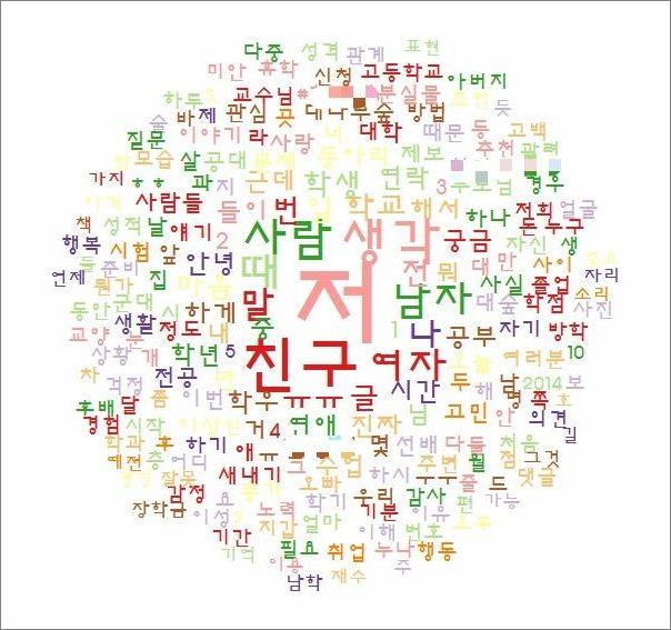 게시물 키워드 분석 결과, ‘저, 친구, 사람, 생각, 나, 남자, 여자, 공부, 연애’ 등 꼽혀